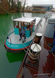 Derrière nous se trouve un joli petit luxemotor, L’ÉTOILE DU SOIR, de 12 m de long et 3,20 m de large. Son propriétaire était inquiet pour son bateau en cas de crues et souhaitait l’amarrer bord à bord à notre péniche, plus haute, pour davantage de sécurité.